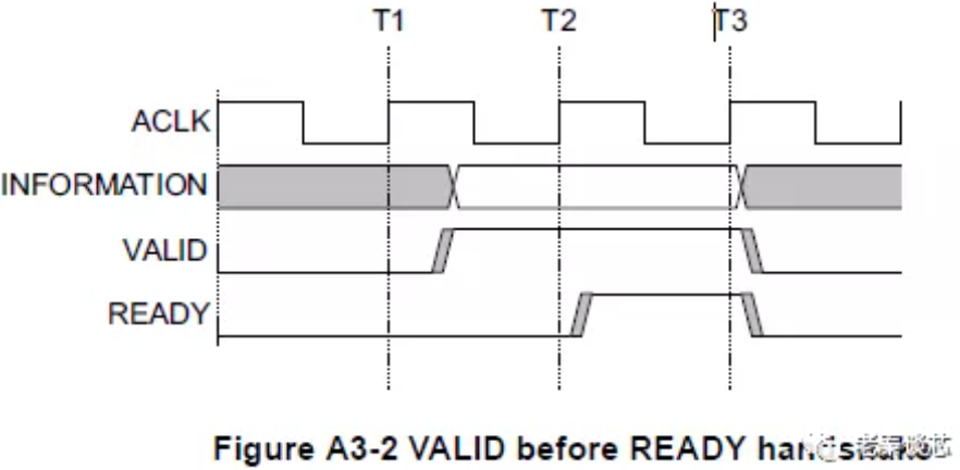 发送方的VALID信号和接收方的READY信号并不需要同时置位,可以发送方先准备好,也可以接收方先准备好。也就是说VALID可以早于READY,也可以晚于READY,也可以同时置位。对应的就是下面三种情况。