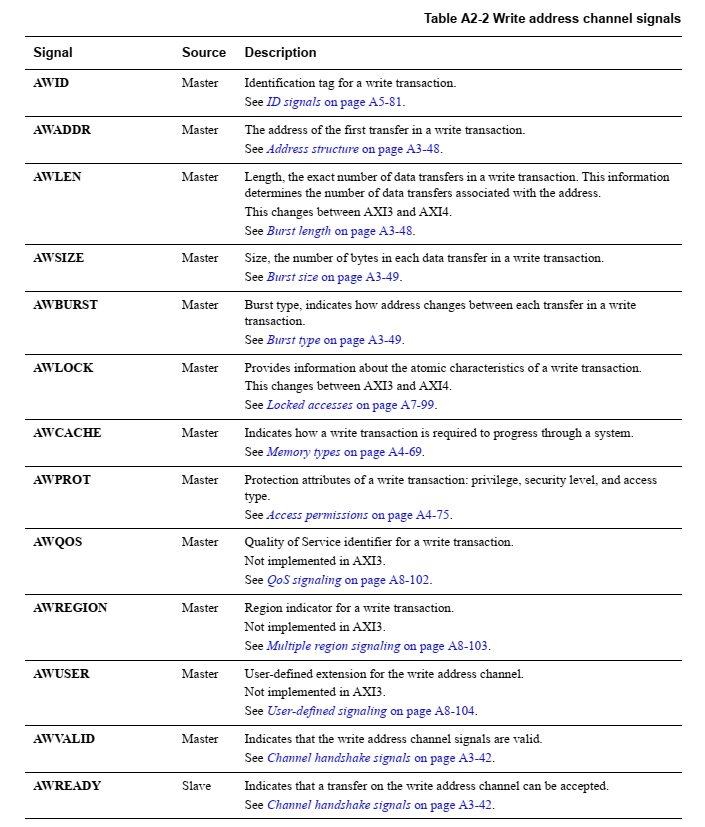 时钟信号和复位信号作为全局信号,没啥好说的。AXI的五个通道的信号如下,先是写地址通道: