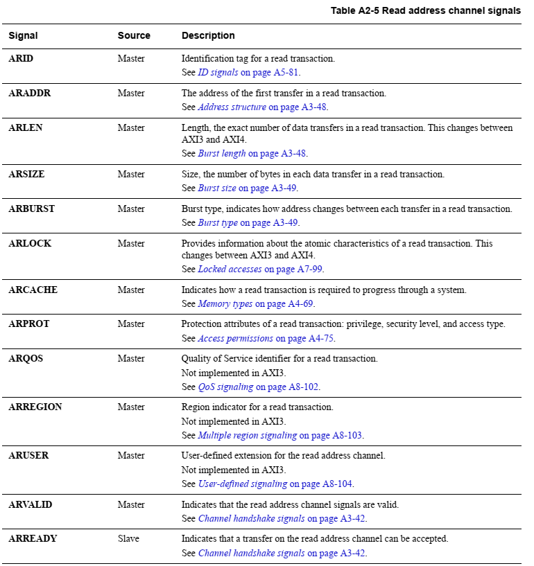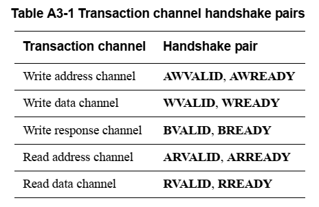 从上述的信号列表我们可以看出来,每个通道都有自己的VALID/READY信号。这种VALID/READY握手机制在整个AMBA体系里面广泛采用,不管是做设计还是做验证的同学,一点要熟记。