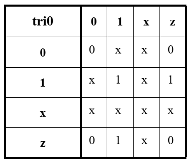 当没有驱动器驱动tri0,具有pull强度的值为0。当没有驱动器驱动tri1,具有pull强度的值为1。当有多个驱动器驱动tri0或tri1时,被驱动net的驱动器结合强度pull隐式地决定了net的值。逻辑强度建模的讨论见7.9。