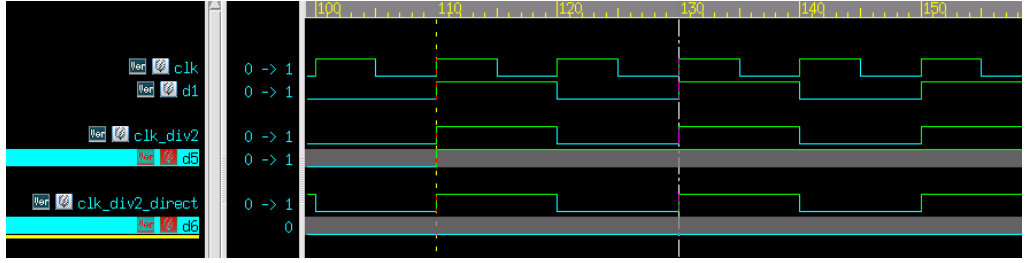 然后用clk触发一个不停翻转的寄存器 d1,再分别用两个二分频时钟去采样,保存在 d5 和 d6 中。