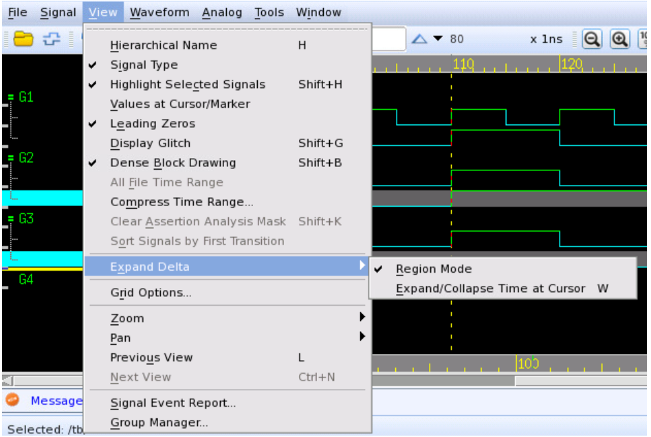 在 Verdi 的 nWave 窗口中选中 View - Expand Delta - Region Mode,把 Cursor 移动到二分频时钟的上升沿,然后点击 Expand/Collapse Time at Cursor,简单点的话直接按 w 键。