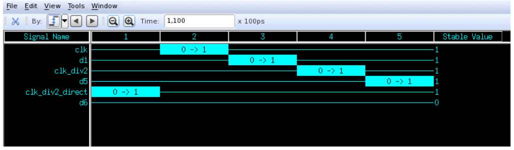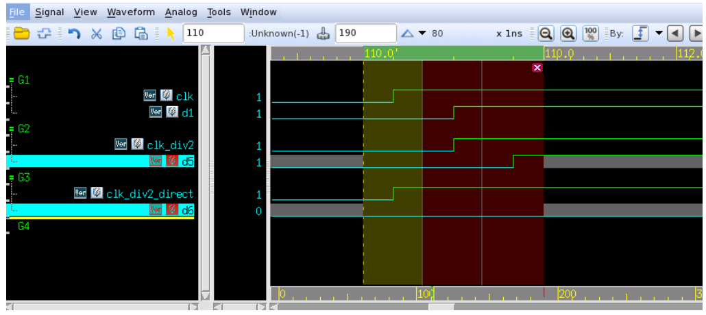 然后用Verdi打开生成的fsdb波形。正常的话,可以看到 d5 和 d6 的波形是完全不同的,一个是常0,一个是常1。
