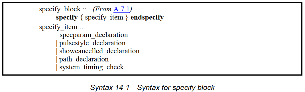一个称为指定块的块语句是用来描述源和目标之间的路径以及为这些路径分配延迟的工具。指定块的语法见语法14-1。