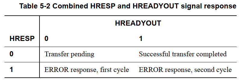 由表5-1可知,完整的传输响应是HRESP和HREADYOUT信号的组合。