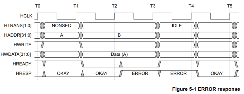 由于总线的流水线特性,需要两个周期的响应。当从机开始发出错误响应时,接下来的传输地址已经被广播到总线上了。两个周期的响应为主机提供了足够的时间来取消下一次访问,并在下一次传输开始之前将HTRANS[1:0]驱动到IDLE。