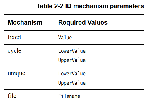 Unique --- 事务不使用当前正在由未完成事务使用的ID值。这使用与循环机制相同的方法。如果一个ID值正在使用,则选择下一个当前未使用的可用ID值。要求上下限之间可用的ID值的数量至少与未完成事务的最大数量一样大,参见第4-37页的生成器规范。
