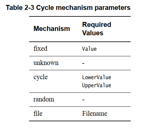 并非所有流量通道环境都支持使用随机机制。如果指定了随机机制,但不支持随机机制,则使用循环机制代替随机机制。该机制以一个0作为较低的值,并使用一个与事务大小可以表示的最大数据值相等的上值。循环机制参数如表2-3所示。