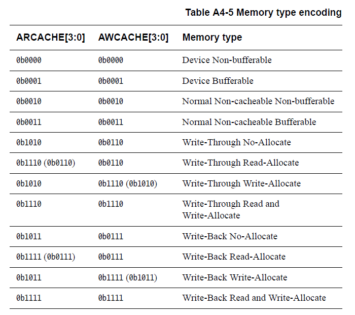 在AXI4中,读分配和写分配位的含义被更新,因此,一个位表示为事务进行了分配,另一个位表示由于另一个事务可能进行了分配。