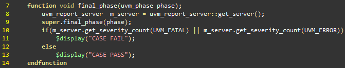 在uvm_test或者env的final_phase里面,检查UVM_ERROR和UVM_FATAL的个数,如果不都为零,打印CASE FAIL;否则打印CASE PASS。