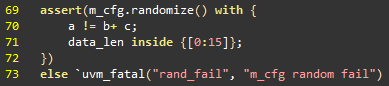 对于像uvm_do_with、uvm_rand_send等内嵌的隐式随机约束,不能直接加assert,需要在仿真log里面对随机约束失败进行排查。
