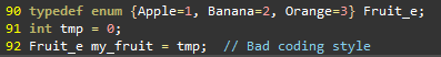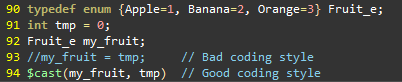最常见的就是把一个int变量直接赋值给一个枚举变量时,类型转换失败,如下面代码片段3所示。