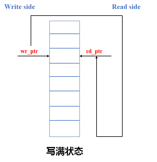 同理,当写地址指针再次追上读地址指针,FIFO便是写满状态,就像下图