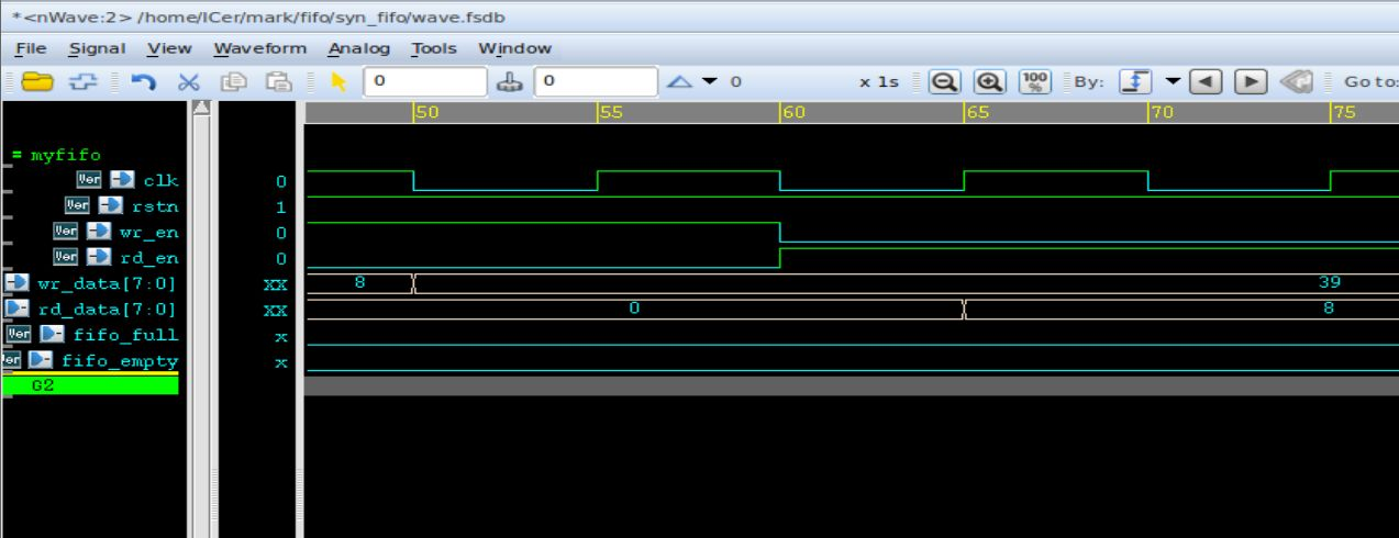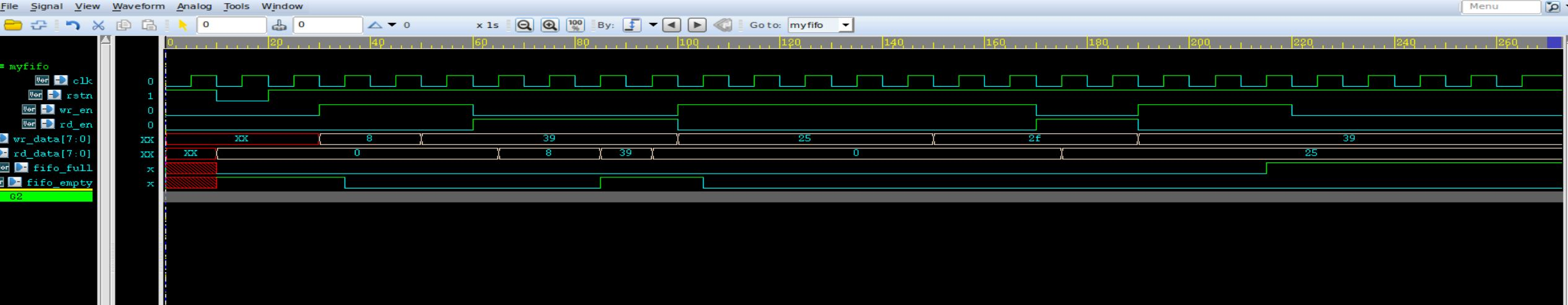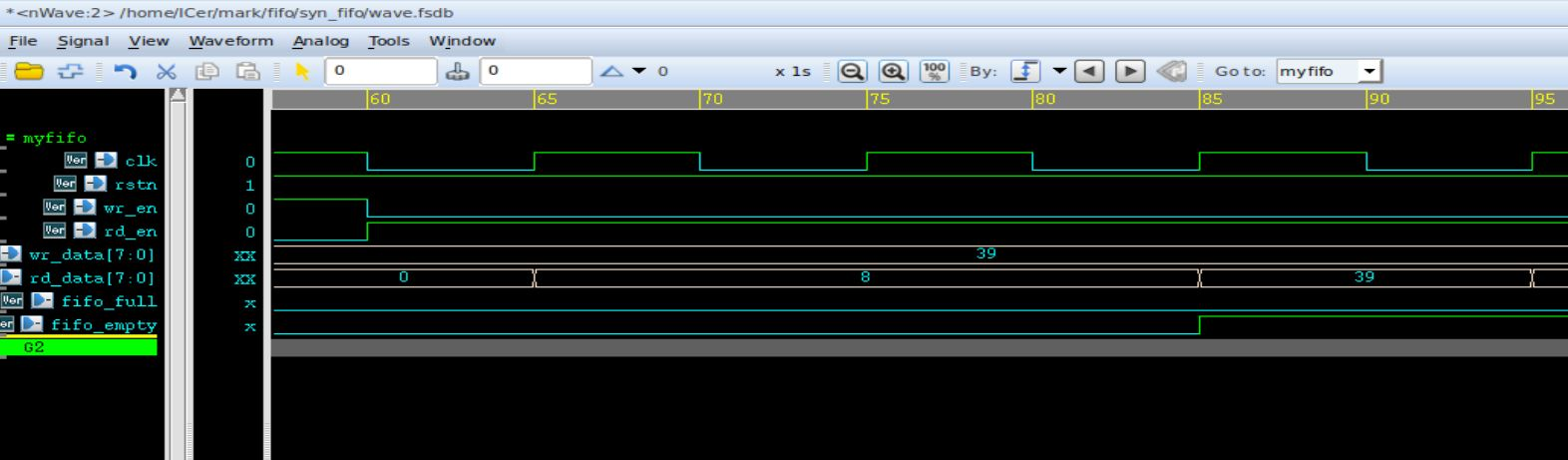拉低wr_en,拉高rd_en开始读取数据,此处可以看出,读取数据时,先读取出两个8,随后读取一个39,随后fifo_empty被拉高,因为此时FIFO中已经没有数据可供读取Verilog中的FIFO设计-同步FIFO篇.