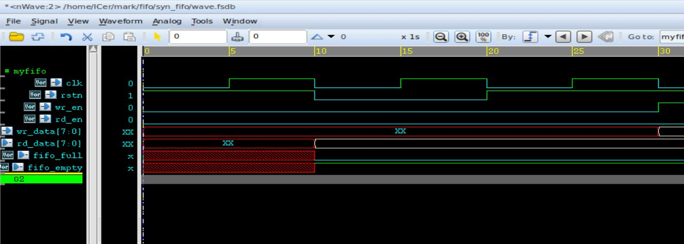 在初始阶段,我们并未给出wr_data的数据,也并未向FIFO中写入任何数据,所以此时FIFO一直是空的(fifo_empty拉高)