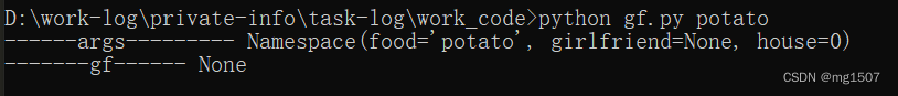 python gf.py -gf jingjing tomato,该种方式会将jingjing赋值给girlfriend,tomato赋值给food