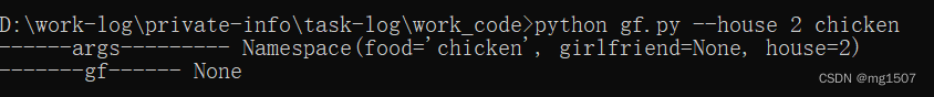 python gf.py --house 2 chicken,该种方式会将house赋值为2,food赋值为chicken