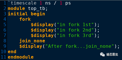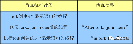 示例中,fork...join_none执行时,首先针对其中的语句创建三个线程,但是创建后并不会马上执行,而是触发了fork...join_none之后语句后才会执行已经创建的三个线程,所以从仿真结果中我们可以看到,首先显示了fork...join_none之后的显示语句,然后才显示了fork...join_none之中的三条显示语句。可见fork...join_none中创建的线程并不是立刻执行,而是只有触发了其后的线程之后才会被执行。