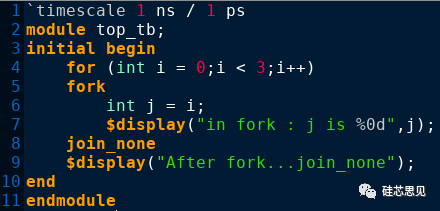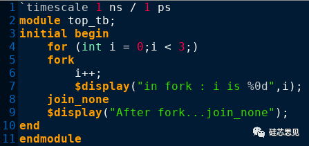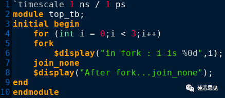 示例中,第三次循环结束时,循环变量递增为3,然后程序再次准备执行第四次循环,但是此时循环变量的值为3,不满足循环条件,所以第四次循环不会进行。可见循环变量如果没有在循环体内部额外进行处理的话,那么在当前次循环执行完后循环变量会自动按照循环变量调整表达式进行调整。在了解了for循环循环变量自动变化的这个特点之后,我们再对fork...join_none的执行特点进行示例说明。