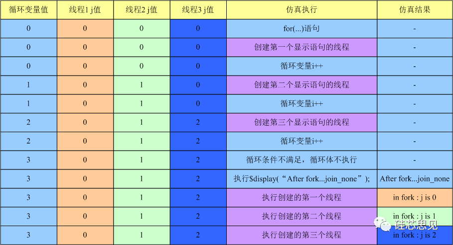 此例结构同上例,唯一不同的在于j声明的时候并没有给j赋初值,所以在每次创建线程时j并没有被赋值。而j被赋值为i的操作实际上算为fork...join_none创建的一个线程,所以j获得的i实际上是fork...join_none已经完成所有线程的创建了。在fork...join_none后语句执行后,依次启动已经创建的线程,在这些线程执行的时候,循环变量i的值已经是3了,所以每个启动的线程在执行时,进行对j赋值时,j获得的是循环变量最后的值,即所有3个线程获得的i都是一个值。
