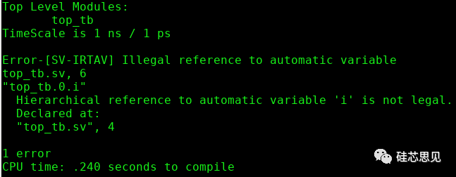 编译错误!示例中,静态变量在声明的同时进行了初始化,此操作应该在仿真开始就执行(静态变量的初始化在仿真开始时进行),而仿真开始时,实际上for循环并没有执行,即此时i还不存在,所以此时编译错误!那么如果将声明和初始化分开是否合适呢?这时仿真结果与将automatic变量j的声明和初始化分开效果一样,即每个线程获得的i的值相同,都是i最后一次循环执行完后的递增值3.