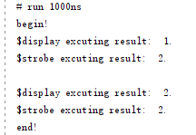 当许多语句与 $display 任务在同一时间内执行时,这些语句和 $display 的执行顺序是不确定的,一般按照程序的顺序结构执行。两者的区别在于:$strobe命令会在当前时间部结束时完成;而$display是只要仿真器看到就会立即执行。