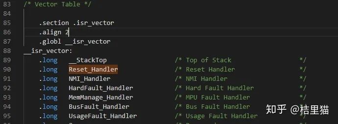 上图就是定义的中断向量表,其实你可以理解这个就是各个小函数的地址。要放在Flash的0位置处。例如你要运行Reset_Handler这个小程序,PC就会先先访问这个中断向量表,得知Resethandler在哪个地址,然后PC跳到相应的位置开始执行Resethandler, 里面定义了各种中断发生后CPU要做的事儿(小程序)。