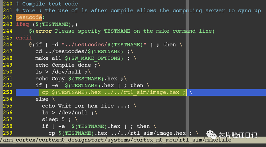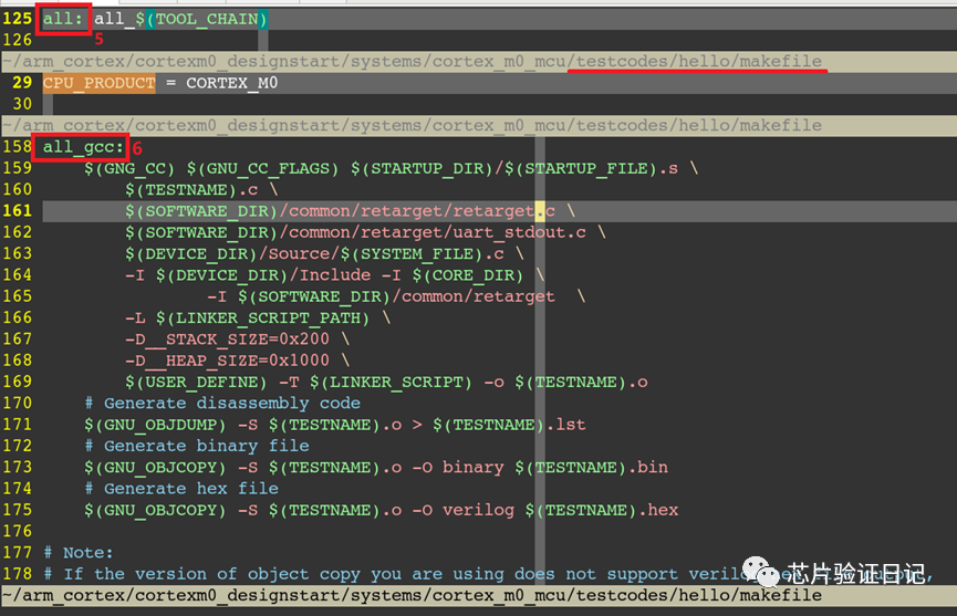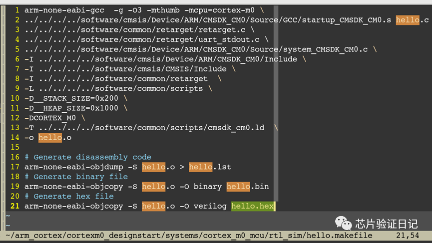 主要是利用arm自带的c语言编译器(arm-none-eabi-gcc),将hello.c编译成hello.hex文件。目的是,在仿真开始通过initail语句初始化在ROM中,供rtl仿真使用。