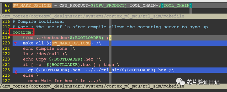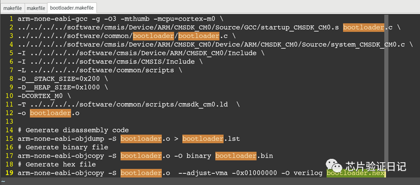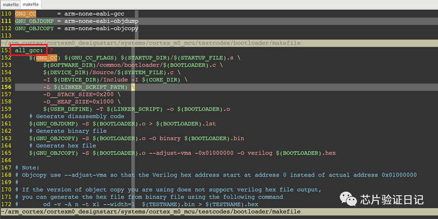 利用arm-none-eabi-objcopy工具可以将elf文件转化为适合于mcu的bin文件和hex文件,其中参数-O(大写o)用于指定输出文件的格式(默认是bin格式) - 仿真主目录下makefile分析(bootrom)