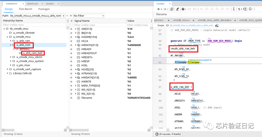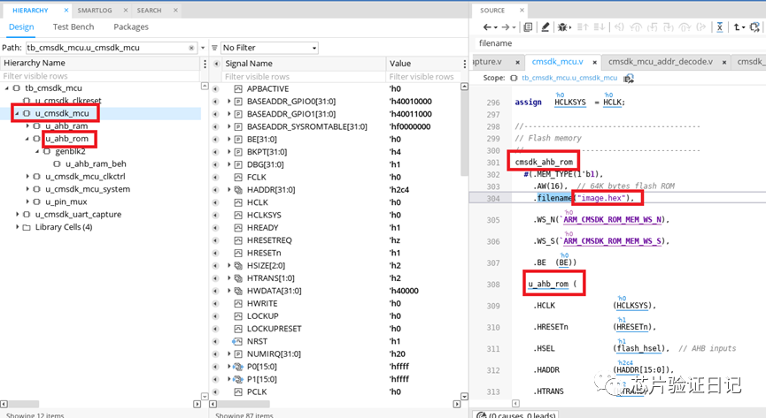 step2: 如下图所示,在文件cmskd_ahb_mcu.v中将image.hex传给了文件cmsdk_ahb_rom.v的filename了。
