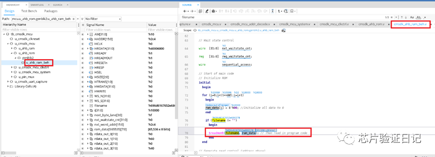 step4: 如下图所示,在文件cmsdk_ahb_ram_beh.v中,通过$readmemh这个系统函数,将image.hex以filename的形式传给ram_data这个二维数组了。