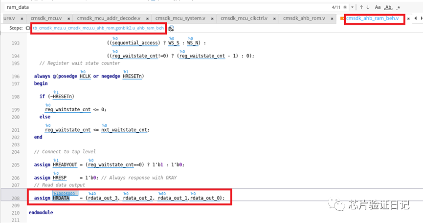 step6: 如下图所示,在文件cmsdk_ahb_ram_beh.v中,rdata_out0/1/2/3中的数据又被ahb总线读走了。