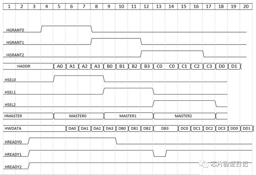 当Master被授予总线并执行固定长度的突发时,不需要继续请求总线以完成突发。仲裁器(Arbiter)会监视突发的进展,并使用HBURST[2:0]信号来确定Master需要多少次传输。