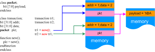 示例中构造函数new()被调用后,就会创建一个transaction的实例,这时就会为其开辟一块存储transaction数据类型的空间,声明的句柄tr就指向该空间的起始地址。