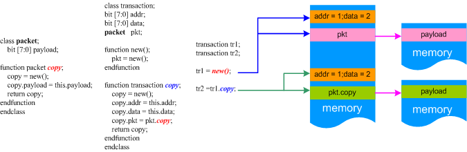 使用SystemVerilog搭建环境的时候,经常会遇到需要对一个对象进行复制,以防止对象的方法修改原始对象的值。对于初学者经常会使用new函数来实现class的内建的复制功能,但是,当要复制的对象中含有其他对象(object)时,使用内建的复制功能将会得到不期望的结果。本文将示例说明shallow copy和deep copy的区别;