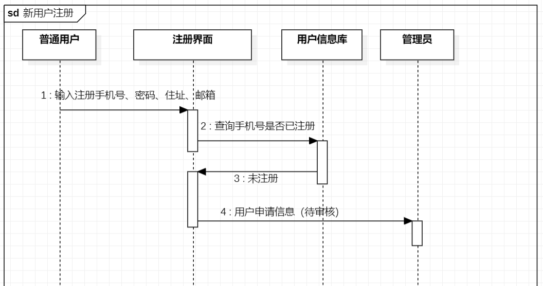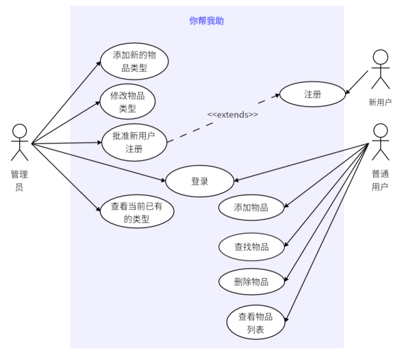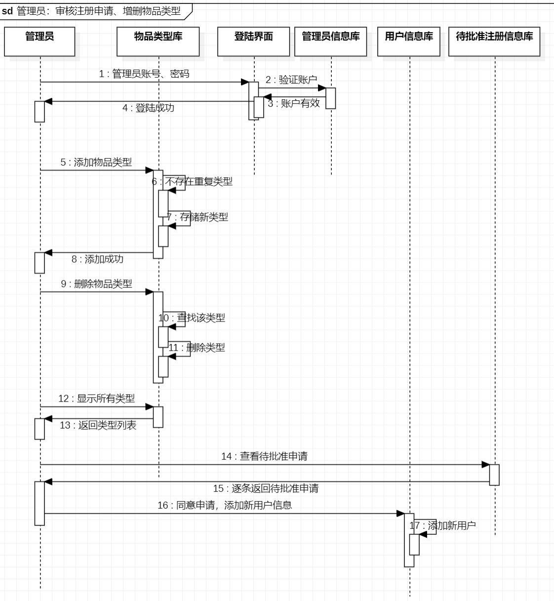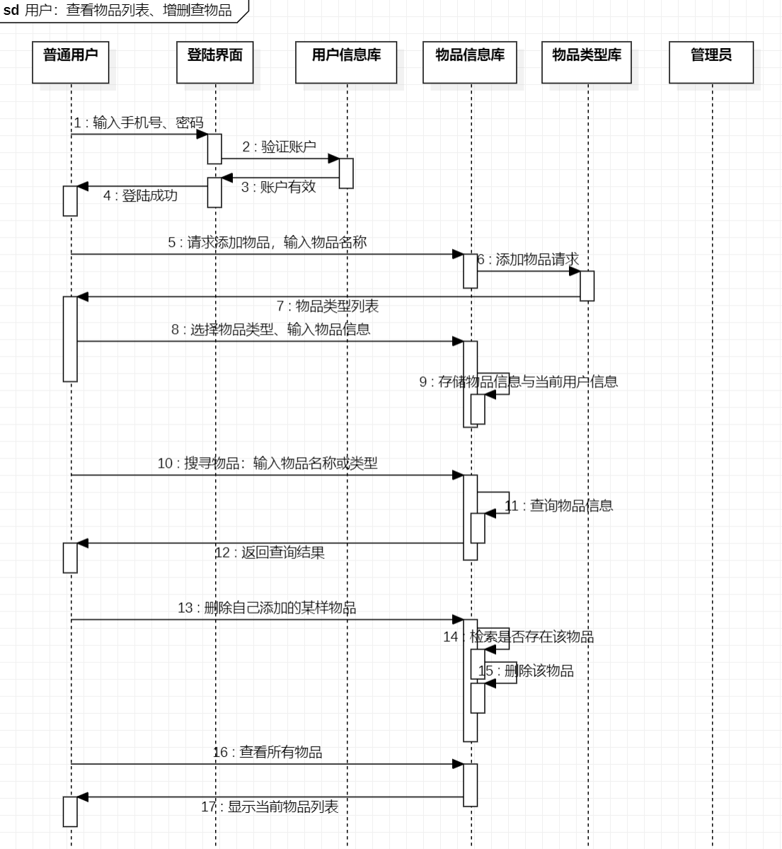 在正式编写代码前,我对照系统应有的功能构思了整体结构,并通过数版用例图、类图与顺序图细化了软件设计,最后确定了三个主要页面:首页、管理员界面、普通用户界面。三个页面对应使用者的身份,实现相应的功能:首页针对尚未登录的用户,可以进行新用户注册、管理员登录、普通用户登录、退出系统功能;管理员界面顾名思义适用于管理员,可以实现审批用户注册申请、显示物品类型列表、增删类型与返回首页的功能;普通用户界面适用于普通用户,可以进行物品列表显示、增删查找物品与返回首页的功能。三个页面之间以“登录”“返回”按钮为接口实现切换。具体的用例图、类图、顺序图如下: