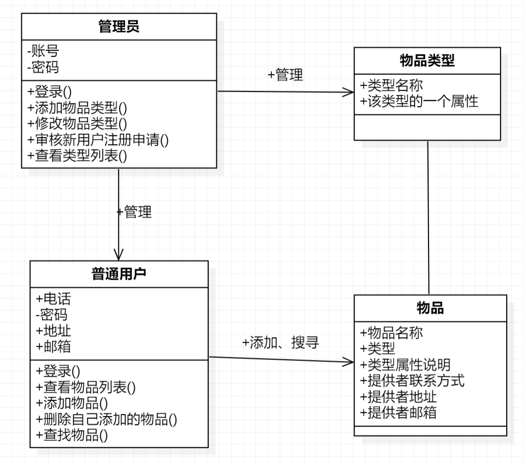 上述图片其实相较初次绘制的版本有所改动,包括整体代码的编写也并没能完全按照最初的设计进行,说明软件设计的过程仍然有所疏漏,包括对功能实现细节的理解不到位、该以什么样的形式存储用户信息、如何处理类型与物品的关系等等,这些问题其实在代码编写过程中都有所改动,而理想的状态则是在软件实现前设计完成。
