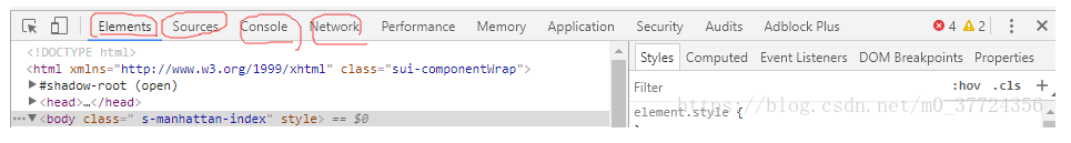 首先介绍Chrome开发者工具中,调试时使用最多的三个功能页面是:元素(ELements)、控制台(Console)、源代码(Sources),此外还有网络(Network)等。