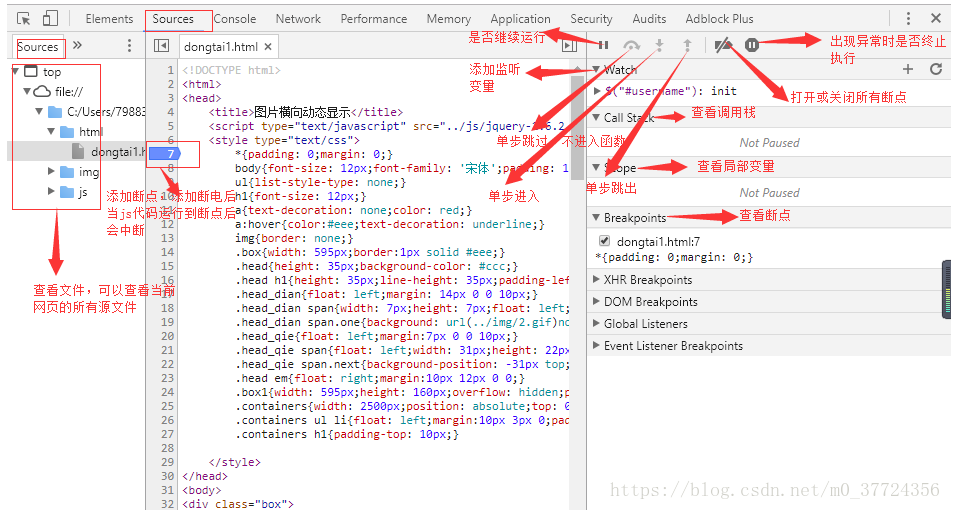 源代码(Sources):该页面用于查看页面的HTML文件源代码、JavaScript源代码、CSS源代码,此外最重要的是可以调试JavaScript源代码,可以给JS代码添加断点等。