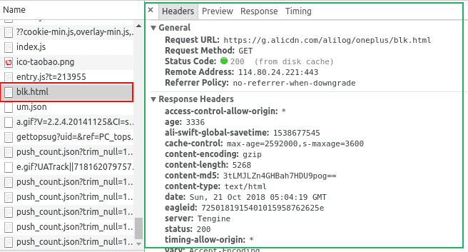 详情窗口包括,Headers(请求头)、Preview(预览响应)、Response(服务器响应内容)和Timing(耗时)。