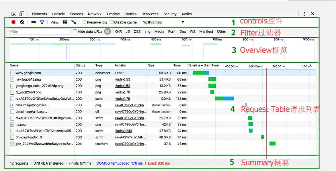 定义:Network 面板记录页面上每个网络操作的相关信息,包括详细的耗时数据、HTTP 请求与响应标头和 Cookie