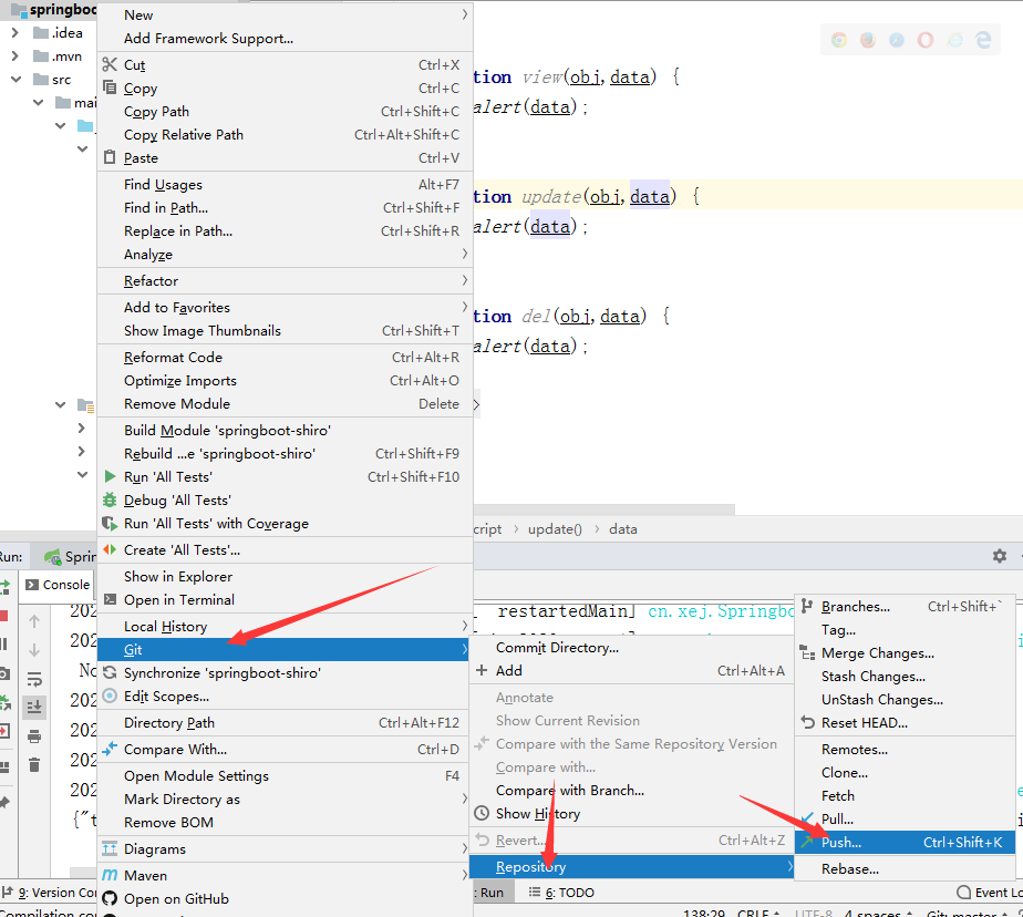 然后选中自己要提交到github中的项目,然后就能在项目路径中看到隐藏的.git文件