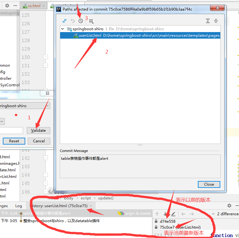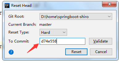 这里我想回到 d74e558的版本 ,在 To Commit 中 填写即可