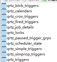 CREATE TABLE QRTZ_JOB_DETAILS ( SCHED_NAME VARCHAR(120) NOT NULL, JOB_NAME VARCHAR(200) NOT NULL, JOB_GROUP VARCHAR(200) NOT NULL, DESCRIPTION VARCHAR(250) NULL, JOB_CLASS_NAME VARCHAR(250) NOT NULL, IS_DURABLE VARCHAR(1) NOT NULL, IS_NONCONCURRENT VARCHAR(1) NOT NULL, IS_UPDATE_DATA VARCHAR(1) NOT NULL, REQUESTS_RECOVERY VARCHAR(1) NOT NULL, JOB_DATA BLOB NULL, PRIMARY KEY (SCHED_NAME,JOB_NAME,JOB_GROUP) ); CREATE TABLE QRTZ_TRIGGERS ( SCHED_NAME VARCHAR(120) NOT NULL, TRIGGER_NAME VARCHAR(200) NOT NULL, TRIGGER_GROUP VARCHAR(200) NOT NULL, JOB_NAME VARCHAR(200) NOT NULL, JOB_GROUP VARCHAR(200) NOT NULL, DESCRIPTION VARCHAR(250) NULL, NEXT_FIRE_TIME BIGINT(13) NULL, PREV_FIRE_TIME BIGINT(13) NULL, PRIORITY INTEGER NULL, TRIGGER_STATE VARCHAR(16) NOT NULL, TRIGGER_TYPE VARCHAR(8) NOT NULL, START_TIME BIGINT(13) NOT NULL, END_TIME BIGINT(13) NULL, CALENDAR_NAME VARCHAR(200) NULL, MISFIRE_INSTR SMALLINT(2) NULL, JOB_DATA BLOB NULL, PRIMARY KEY (SCHED_NAME,TRIGGER_NAME,TRIGGER_GROUP), FOREIGN KEY (SCHED_NAME,JOB_NAME,JOB_GROUP) REFERENCES QRTZ_JOB_DETAILS(SCHED_NAME,JOB_NAME,JOB_GROUP) ); CREATE TABLE QRTZ_SIMPLE_TRIGGERS ( SCHED_NAME VARCHAR(120) NOT NULL, TRIGGER_NAME VARCHAR(200) NOT NULL, TRIGGER_GROUP VARCHAR(200) NOT NULL, REPEAT_COUNT BIGINT(7) NOT NULL, REPEAT_INTERVAL BIGINT(12) NOT NULL, TIMES_TRIGGERED BIGINT(10) NOT NULL, PRIMARY KEY (SCHED_NAME,TRIGGER_NAME,TRIGGER_GROUP), FOREIGN KEY (SCHED_NAME,TRIGGER_NAME,TRIGGER_GROUP) REFERENCES QRTZ_TRIGGERS(SCHED_NAME,TRIGGER_NAME,TRIGGER_GROUP) ); CREATE TABLE QRTZ_CRON_TRIGGERS ( SCHED_NAME VARCHAR(120) NOT NULL, TRIGGER_NAME VARCHAR(200) NOT NULL, TRIGGER_GROUP VARCHAR(200) NOT NULL, CRON_EXPRESSION VARCHAR(200) NOT NULL, TIME_ZONE_ID VARCHAR(80), PRIMARY KEY (SCHED_NAME,TRIGGER_NAME,TRIGGER_GROUP), FOREIGN KEY (SCHED_NAME,TRIGGER_NAME,TRIGGER_GROUP) REFERENCES QRTZ_TRIGGERS(SCHED_NAME,TRIGGER_NAME,TRIGGER_GROUP) ); CREATE TABLE QRTZ_SIMPROP_TRIGGERS ( SCHED_NAME VARCHAR(120) NOT NULL, TRIGGER_NAME VARCHAR(200) NOT NULL, TRIGGER_GROUP VARCHAR(200) NOT NULL, STR_PROP_1 VARCHAR(512) NULL, STR_PROP_2 VARCHAR(512) NULL, STR_PROP_3 VARCHAR(512) NULL, INT_PROP_1 INT NULL, INT_PROP_2 INT NULL, LONG_PROP_1 BIGINT NULL, LONG_PROP_2 BIGINT NULL, DEC_PROP_1 NUMERIC(13,4) NULL, DEC_PROP_2 NUMERIC(13,4) NULL, BOOL_PROP_1 VARCHAR(1) NULL, BOOL_PROP_2 VARCHAR(1) NULL, PRIMARY KEY (SCHED_NAME,TRIGGER_NAME,TRIGGER_GROUP), FOREIGN KEY (SCHED_NAME,TRIGGER_NAME,TRIGGER_GROUP) REFERENCES QRTZ_TRIGGERS(SCHED_NAME,TRIGGER_NAME,TRIGGER_GROUP) ); CREATE TABLE QRTZ_BLOB_TRIGGERS ( SCHED_NAME VARCHAR(120) NOT NULL, TRIGGER_NAME VARCHAR(200) NOT NULL, TRIGGER_GROUP VARCHAR(200) NOT NULL, BLOB_DATA BLOB NULL, PRIMARY KEY (SCHED_NAME,TRIGGER_NAME,TRIGGER_GROUP), FOREIGN KEY (SCHED_NAME,TRIGGER_NAME,TRIGGER_GROUP) REFERENCES QRTZ_TRIGGERS(SCHED_NAME,TRIGGER_NAME,TRIGGER_GROUP) ); CREATE TABLE QRTZ_CALENDARS ( SCHED_NAME VARCHAR(120) NOT NULL, CALENDAR_NAME VARCHAR(200) NOT NULL, CALENDAR BLOB NOT NULL, PRIMARY KEY (SCHED_NAME,CALENDAR_NAME) ); CREATE TABLE QRTZ_PAUSED_TRIGGER_GRPS ( SCHED_NAME VARCHAR(120) NOT NULL, TRIGGER_GROUP VARCHAR(200) NOT NULL, PRIMARY KEY (SCHED_NAME,TRIGGER_GROUP) ); CREATE TABLE QRTZ_FIRED_TRIGGERS ( SCHED_NAME VARCHAR(120) NOT NULL, ENTRY_ID VARCHAR(95) NOT NULL, TRIGGER_NAME VARCHAR(200) NOT NULL, TRIGGER_GROUP VARCHAR(200) NOT NULL, INSTANCE_NAME VARCHAR(200) NOT NULL, FIRED_TIME BIGINT(13) NOT NULL, SCHED_TIME BIGINT(13) NOT NULL, PRIORITY INTEGER NOT NULL, STATE VARCHAR(16) NOT NULL, JOB_NAME VARCHAR(200) NULL, JOB_GROUP VARCHAR(200) NULL, IS_NONCONCURRENT VARCHAR(1) NULL, REQUESTS_RECOVERY VARCHAR(1) NULL, PRIMARY KEY (SCHED_NAME,ENTRY_ID) ); CREATE TABLE QRTZ_SCHEDULER_STATE ( SCHED_NAME VARCHAR(120) NOT NULL, INSTANCE_NAME VARCHAR(200) NOT NULL, LAST_CHECKIN_TIME BIGINT(13) NOT NULL, CHECKIN_INTERVAL BIGINT(13) NOT NULL, PRIMARY KEY (SCHED_NAME,INSTANCE_NAME) ); CREATE TABLE QRTZ_LOCKS ( SCHED_NAME VARCHAR(120) NOT NULL, LOCK_NAME VARCHAR(40) NOT NULL, PRIMARY KEY (SCHED_NAME,LOCK_NAME) );
