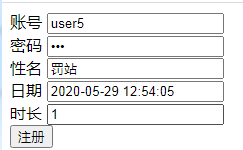 <form> 账号 <input type="text" name="userId" id="userId"><br/> 密码 <input type="password" name="password" id="password"><br/> 性名 <input type="text" name="name" id="name"><br/> 日期 <input type="text" name="date" id="date"><br/> 时长 <input type="text" name="time" id="time"><br/> <button type="button" onclick="register()">注册</button> </form> <script> function register() { var userId = $('#userId').val(); var password = $('#password').val(); var name = $('#name').val(); var date = $('#date').val(); var time = $('#time').val(); $.ajax({ url: '/user/toRegister', type: 'post', data: { userId: userId, password: password, name: name, date: date, time: time }, success: function (dt) { if(dt.code===200){ alert('注册成功'); } } }) } </script>