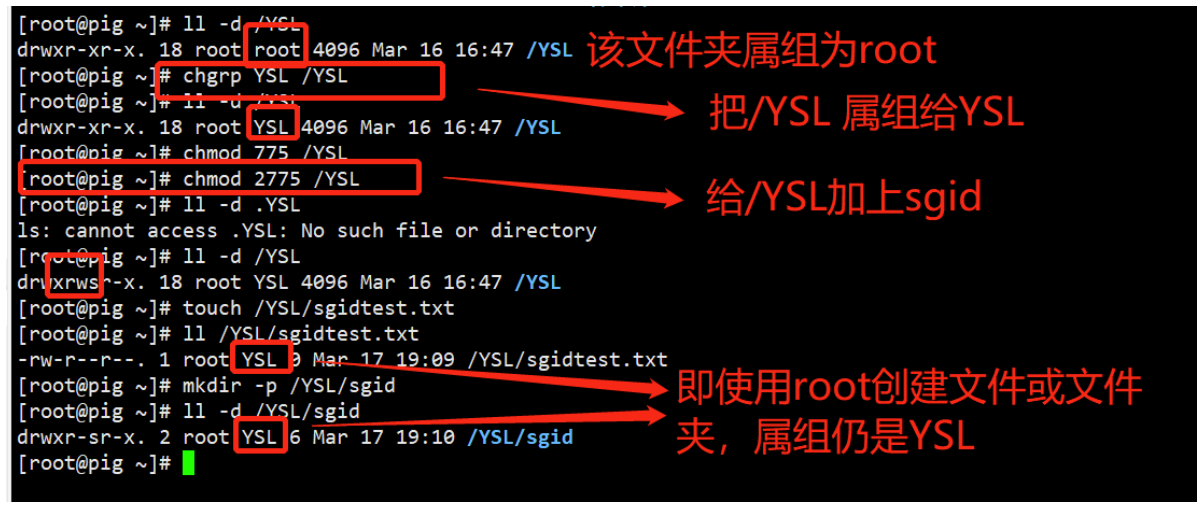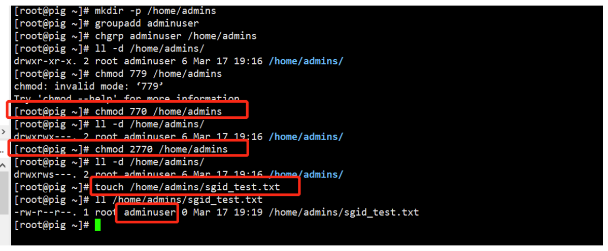 2.sgid主要用于文件夹,为某个目录设置sgid之后,在该目录中的创建的文件,都以(目录的属组)权限为准,而不属于创建该文件的用户权限,这就实现了多个用户,可以共享一个目录的作用。