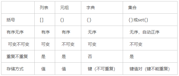 2.总结列表,元组,字典,集合的联系与区别。参考以下几个方面: