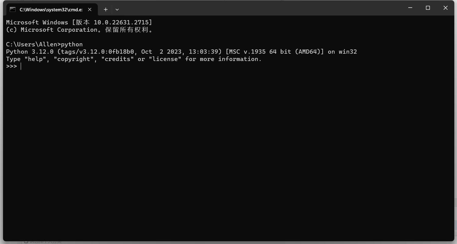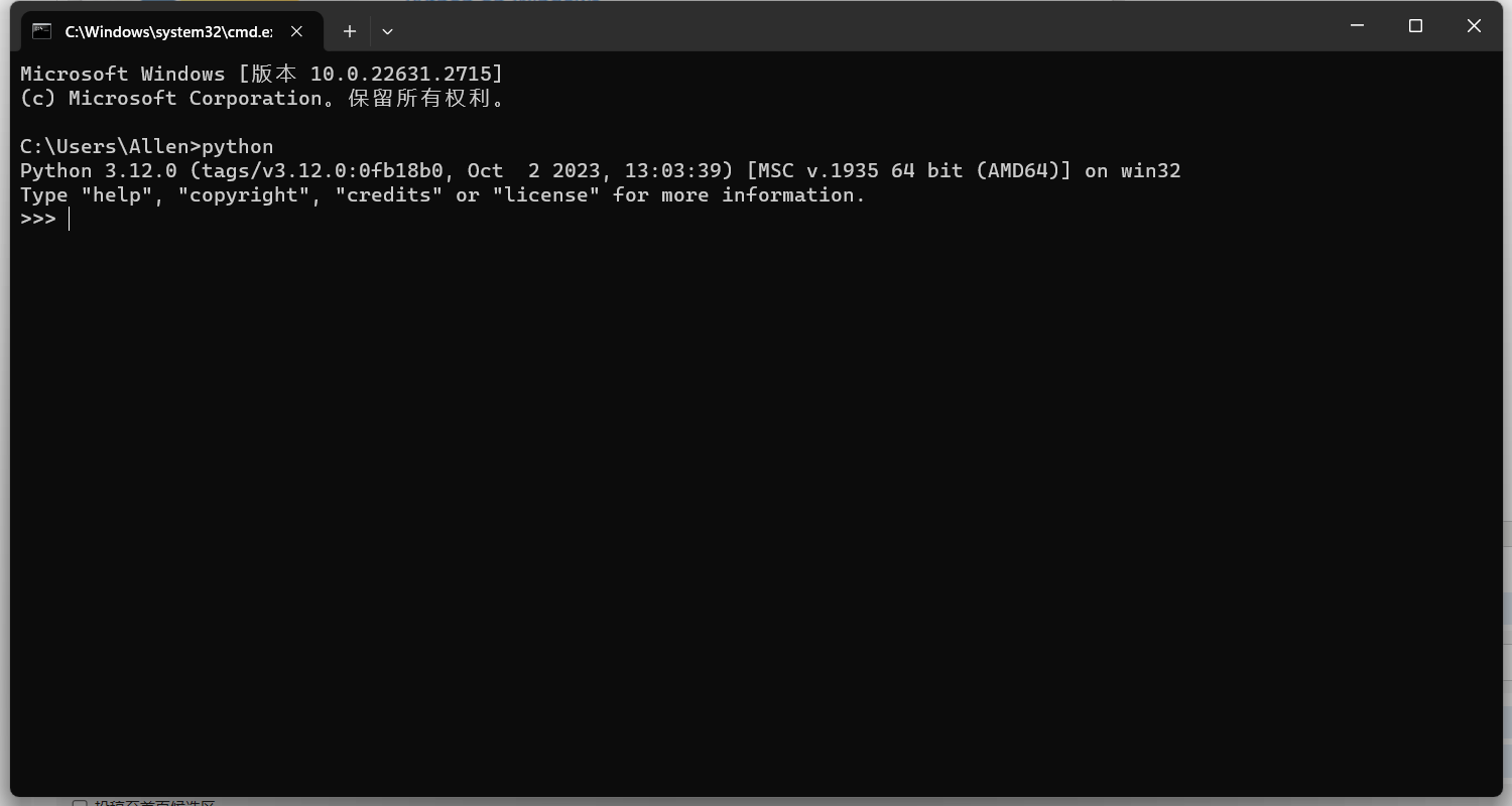 安装完成后win+R,再输入cmd回车,再输入Python,如果出现以下画面则代表安装成功了