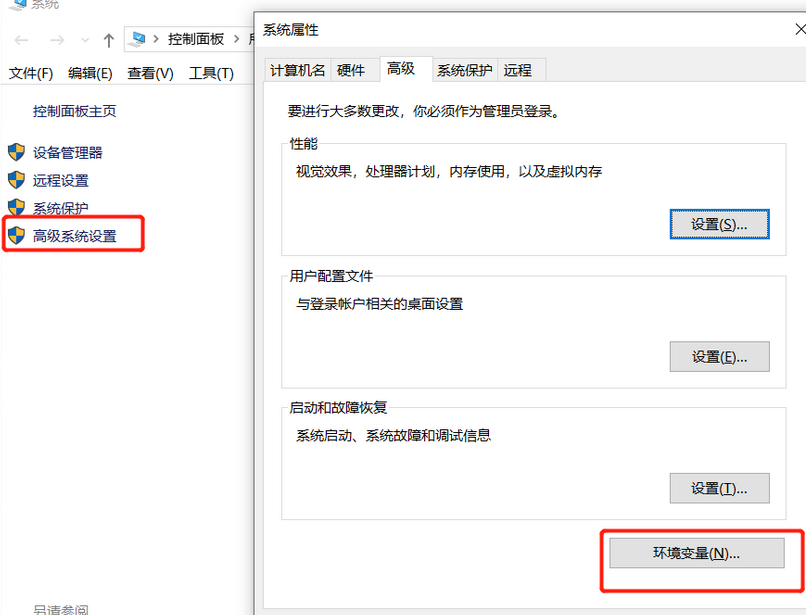 步骤:右键我的电脑–>选择属性–>选择高级系统设置–>选择右下角的环境变量