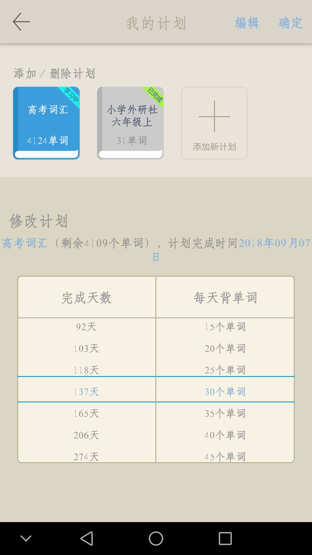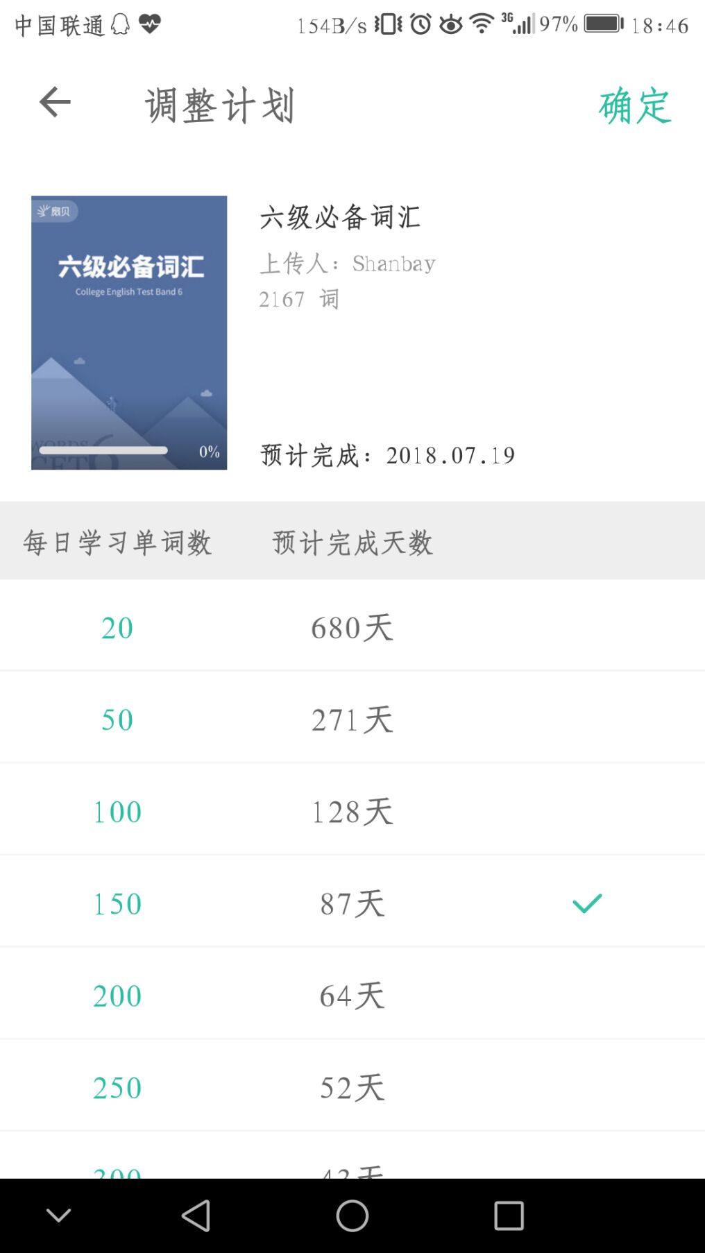 扇贝单词的背单词数的选项是固定的,不能细调,最小为20,然后是50,之后每次增加50,最大值是750;背单词数只能选择这几个选项和与之匹配的完成天数。
